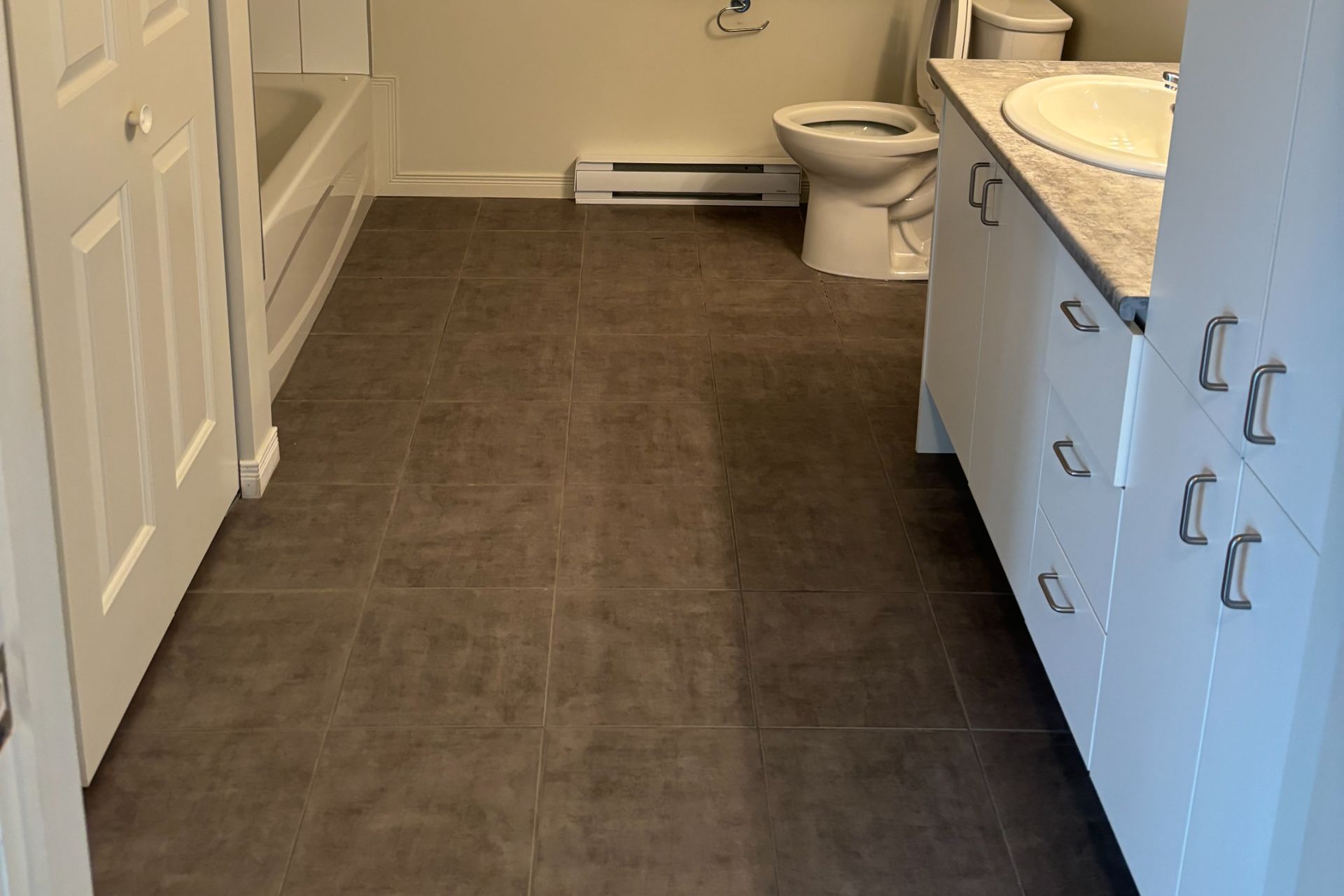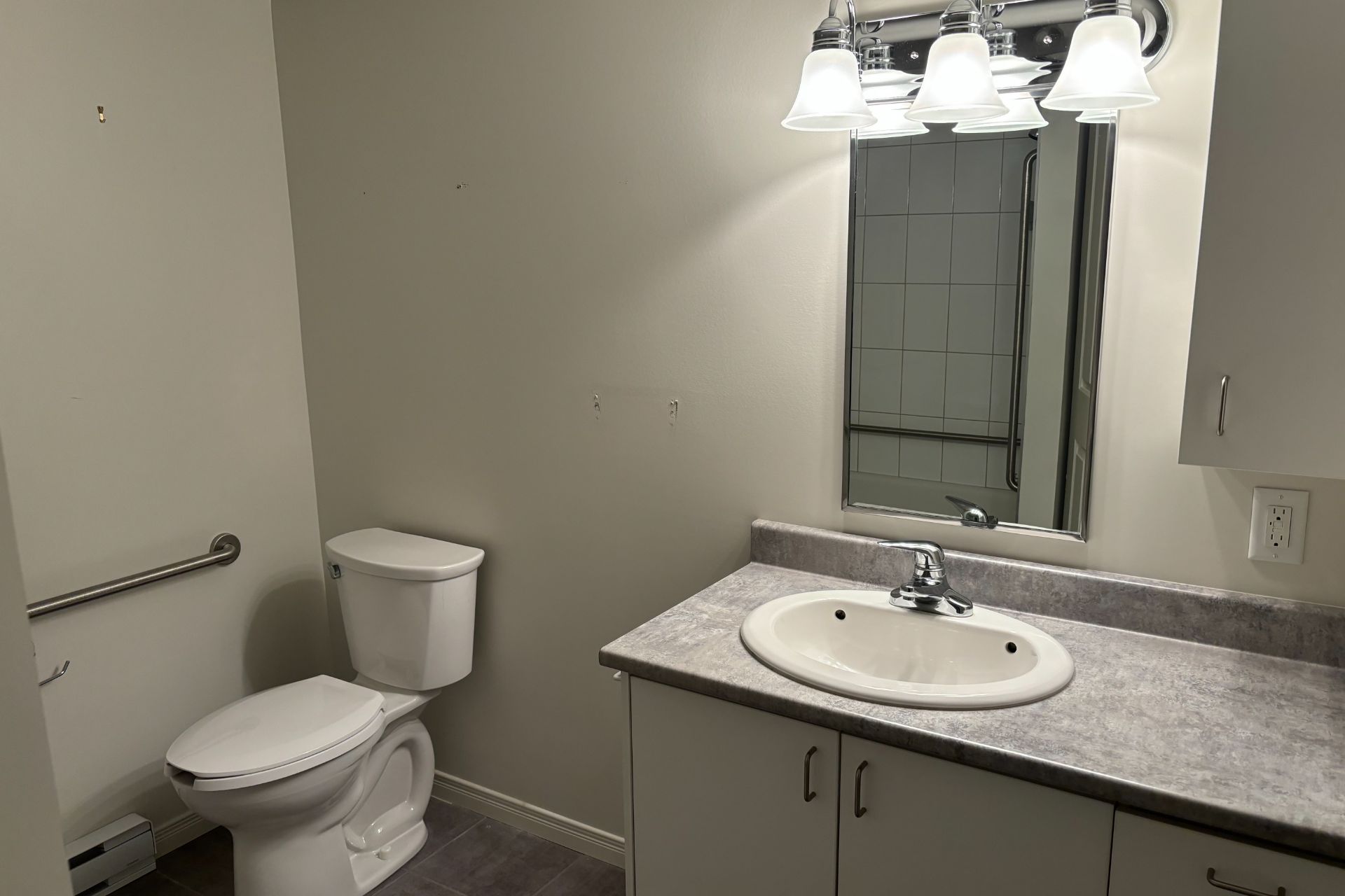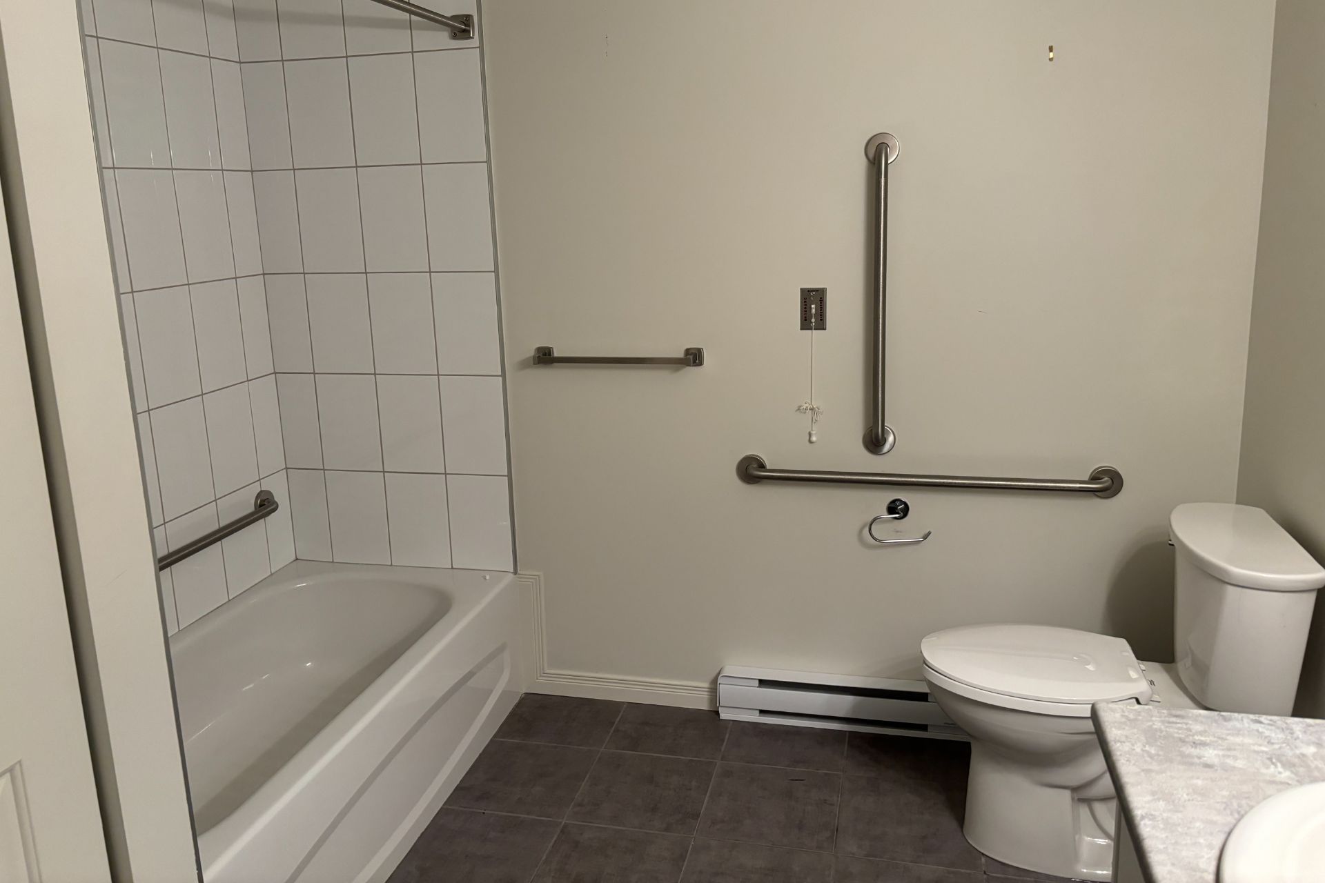 Accessible avec barres d'appui, équipée de revêtements de sol antidérapants en vinyle et en céramique.
